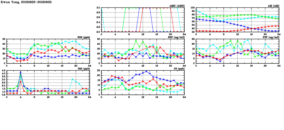 | Air Quality Data Time Series in Kwun Tong (2018/06/25) | ( Line colors: Day -3 Day -2 Day -1 Current day ) | 2D Map Current AQHI |