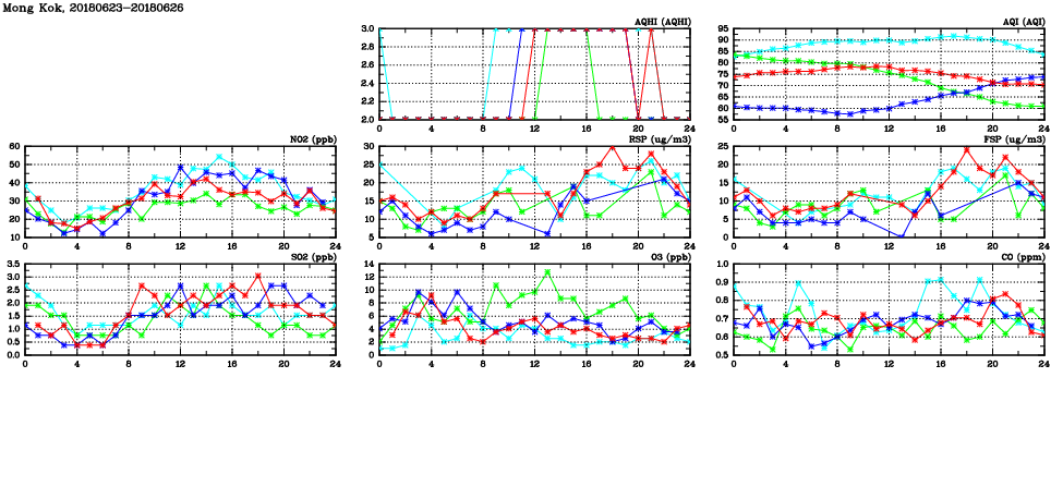 | Air Quality Data Time Series in Mong Kok (2018/06/26) | ( Line colors: Day -3 Day -2 Day -1 Current day ) | 2D Map Current AQHI |