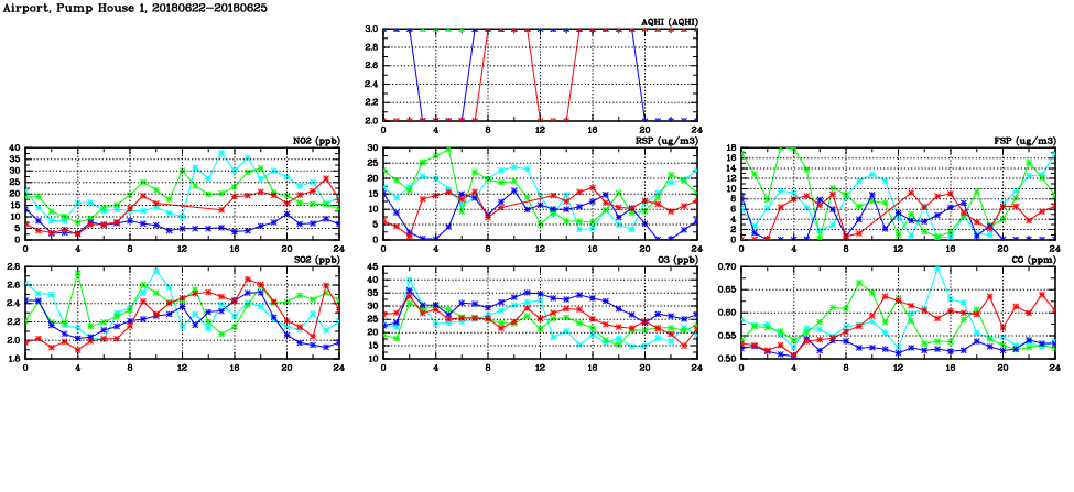 | Air Quality Data Time Series in Airport, Pump House 1 (2018/06/25) | ( Line colors: Day -3 Day -2 Day -1 Current day ) | 2D Map Current AQHI |
