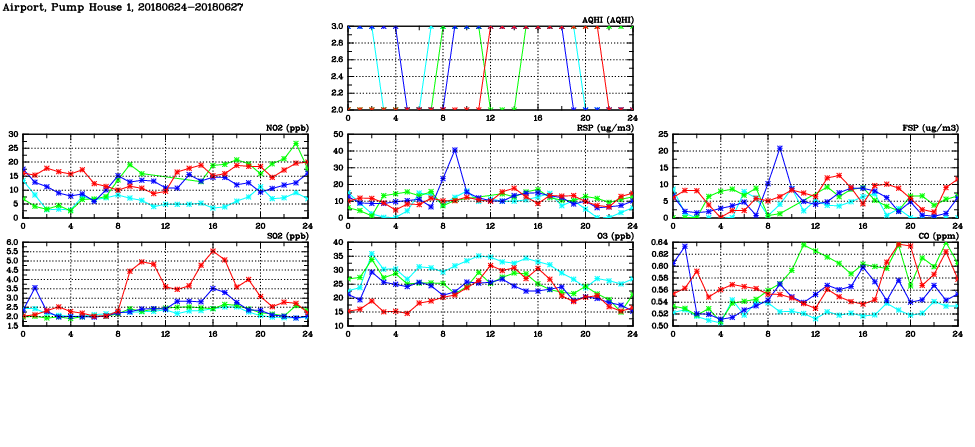 | Air Quality Data Time Series in Airport, Pump House 1 (2018/06/27) | ( Line colors: Day -3 Day -2 Day -1 Current day ) | 2D Map Current AQHI |