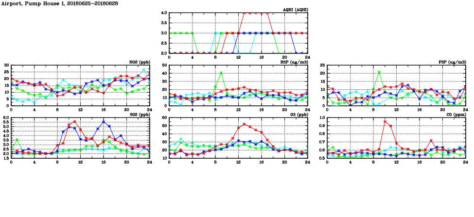 | Air Quality Data Time Series in Airport, Pump House 1 (2018/06/28) | ( Line colors: Day -3 Day -2 Day -1 Current day ) | 2D Map Current AQHI |