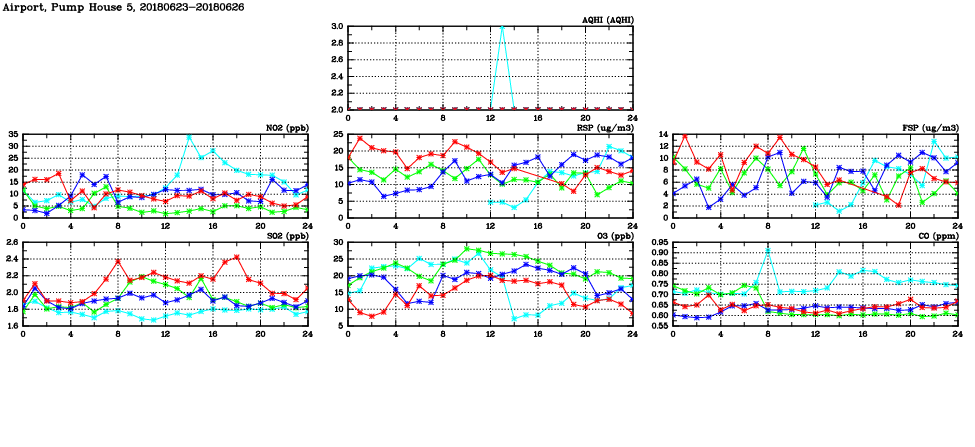| Air Quality Data Time Series in Airport, Pump House 5 (2018/06/26) | ( Line colors: Day -3 Day -2 Day -1 Current day ) | 2D Map Current AQHI |