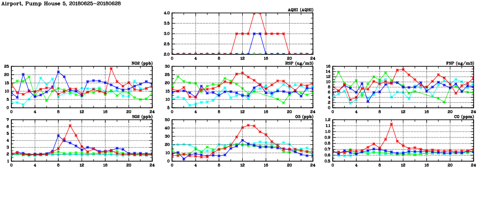 | Air Quality Data Time Series in Airport, Pump House 5 (2018/06/28) | ( Line colors: Day -3 Day -2 Day -1 Current day ) | 2D Map Current AQHI |