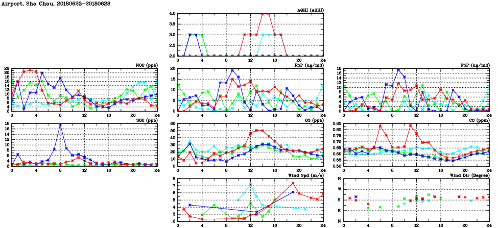 | Air Quality Data Time Series in Airport, Sha Chau (2018/06/28) | ( Line colors: Day -3 Day -2 Day -1 Current day ) | 2D Map Current AQHI |