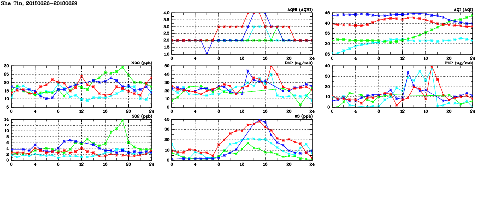 | Air Quality Data Time Series in Sha Tin (2018/06/29) | ( Line colors: Day -3 Day -2 Day -1 Current day ) | 2D Map Current AQHI |