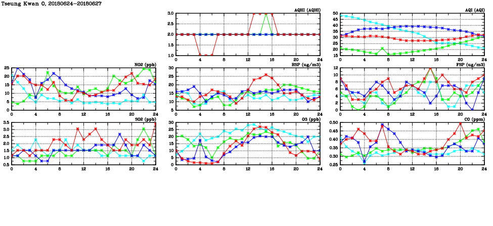 | Air Quality Data Time Series in Tseung Kwan O (2018/06/27) | ( Line colors: Day -3 Day -2 Day -1 Current day ) | 2D Map Current AQHI |