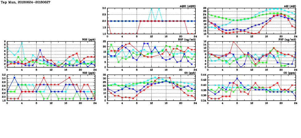 | Air Quality Data Time Series in Tap Mun (2018/06/27) | ( Line colors: Day -3 Day -2 Day -1 Current day ) | 2D Map Current AQHI |