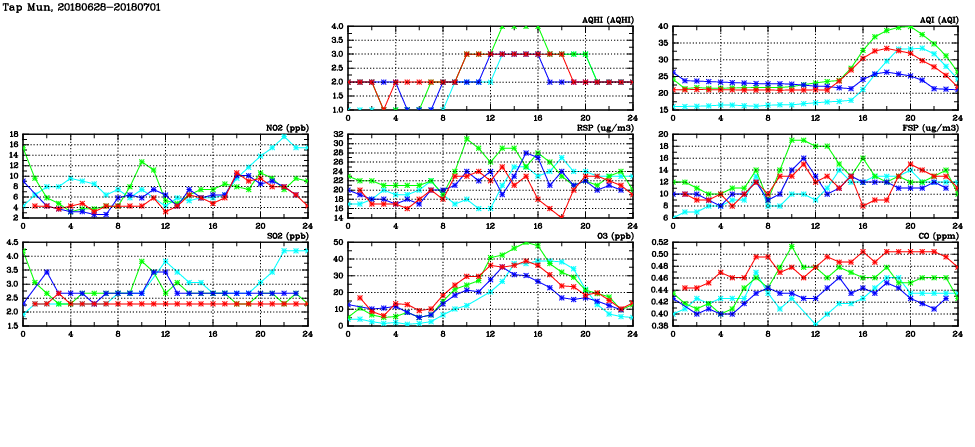 | Air Quality Data Time Series in Tap Mun (2018/07/01) | ( Line colors: Day -3 Day -2 Day -1 Current day ) | 2D Map Current AQHI |