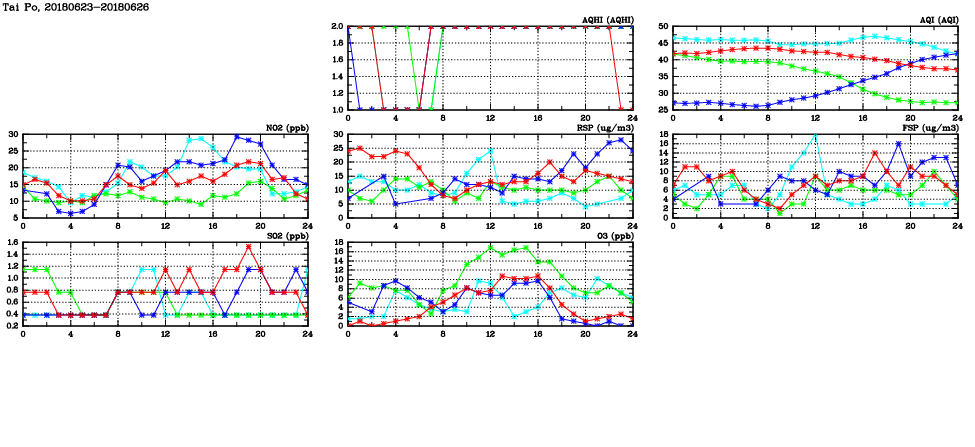 | Air Quality Data Time Series in Tai Po (2018/06/26) | ( Line colors: Day -3 Day -2 Day -1 Current day ) | 2D Map Current AQHI |