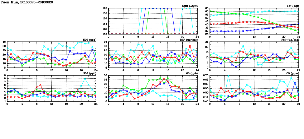 | Air Quality Data Time Series in Tuen Mun (2018/06/26) | ( Line colors: Day -3 Day -2 Day -1 Current day ) | 2D Map Current AQHI |