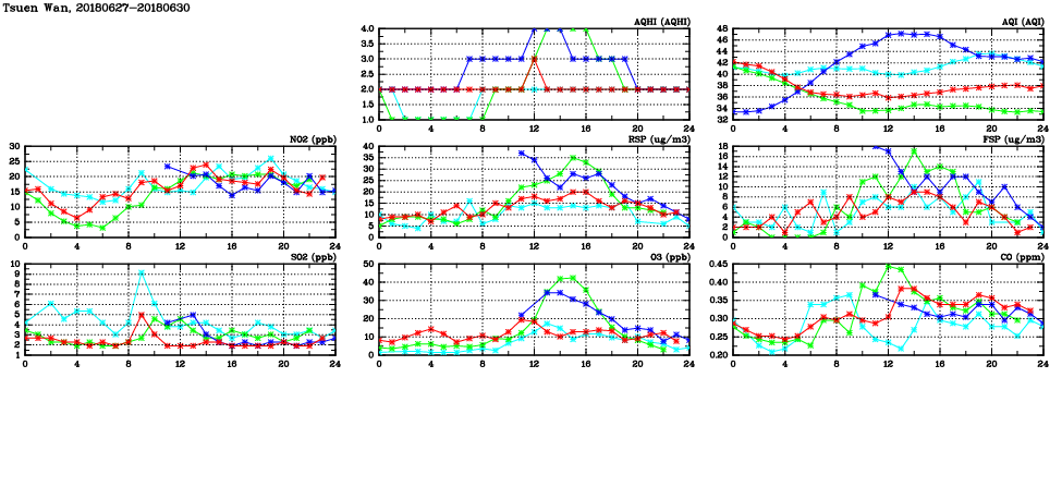 | Air Quality Data Time Series in Tsuen Wan (2018/06/30) | ( Line colors: Day -3 Day -2 Day -1 Current day ) | 2D Map Current AQHI |