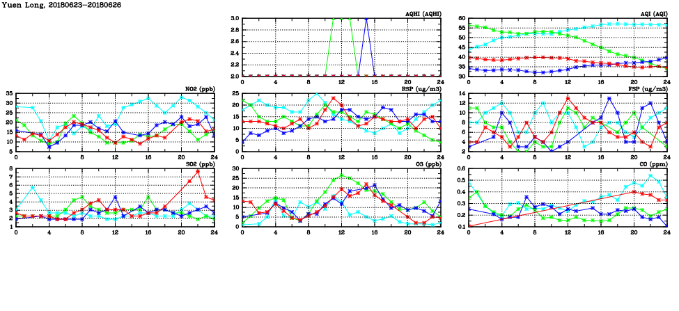 | Air Quality Data Time Series in Yuen Long (2018/06/26) | ( Line colors: Day -3 Day -2 Day -1 Current day ) | 2D Map Current AQHI |