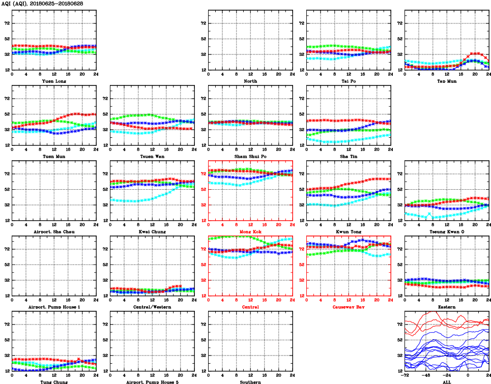 | Air Quality Data Time Series for AQI (2018/06/28) | ( Line colors: Day -3 Day -2 Day -1 Current day ) | 2D Map Current AQHI |