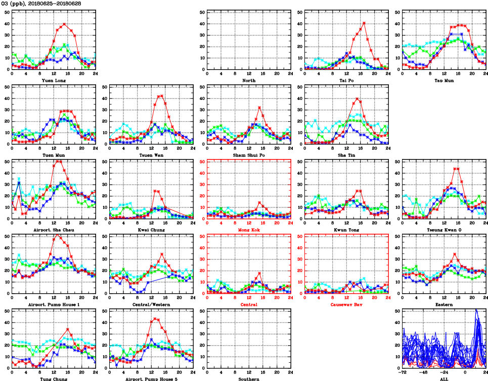 | Air Quality Data Time Series for O3 (2018/06/28) | ( Line colors: Day -3 Day -2 Day -1 Current day ) | 2D Map Current AQHI |