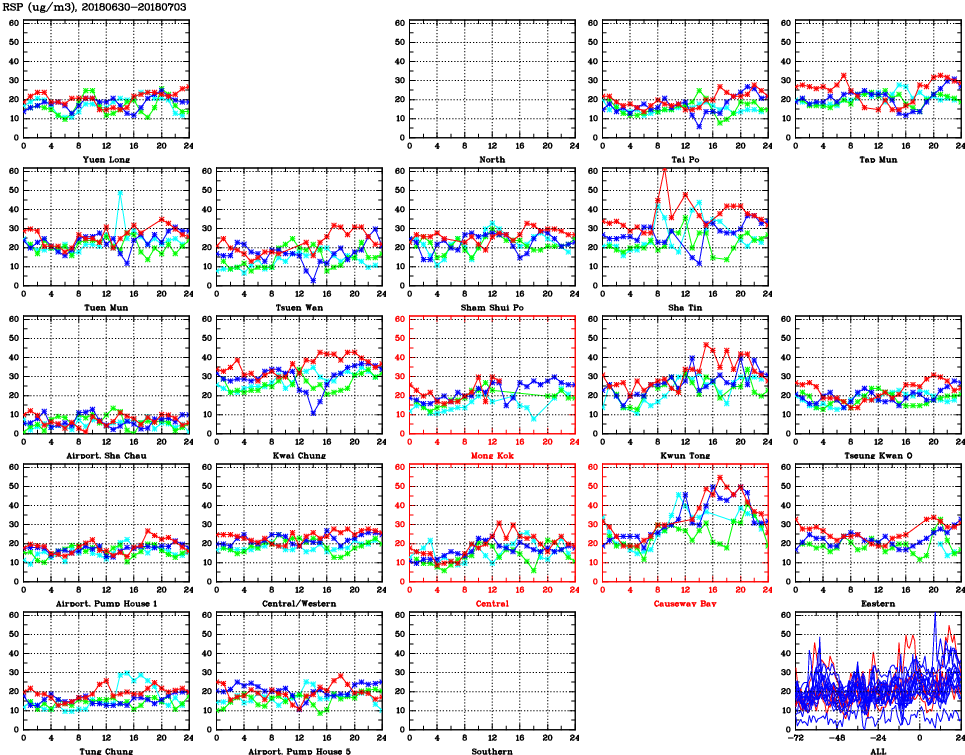 | Air Quality Data Time Series for RSP (2018/07/03) | ( Line colors: Day -3 Day -2 Day -1 Current day ) | 2D Map Current AQHI |