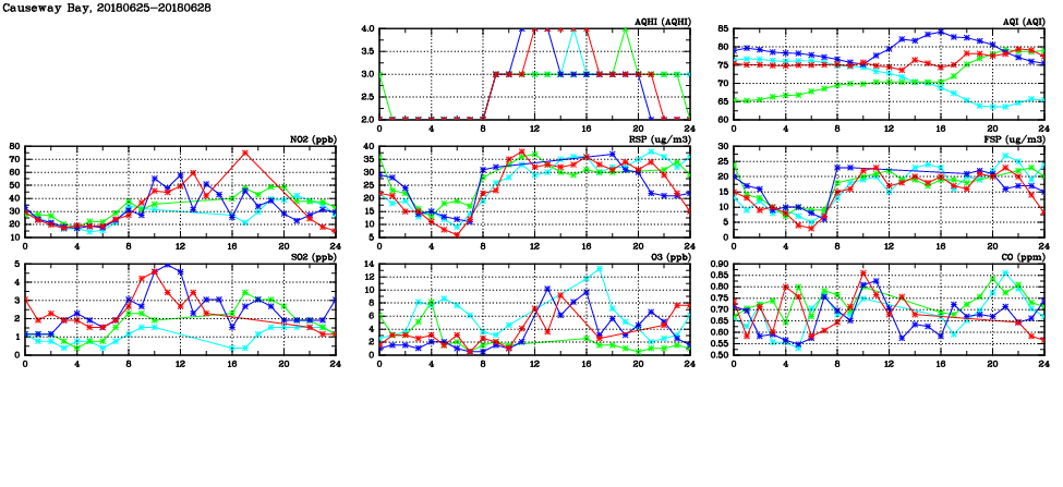 | Air Quality Data Time Series in Causeway Bay (2018/06/28) | ( Line colors: Day -3 Day -2 Day -1 Current day ) | 2D Map Current AQHI |