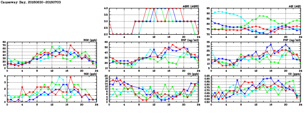 | Air Quality Data Time Series in Causeway Bay (2018/07/03) | ( Line colors: Day -3 Day -2 Day -1 Current day ) | 2D Map Current AQHI |