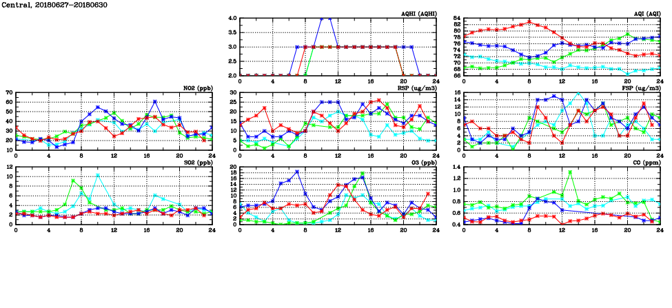 | Air Quality Data Time Series in Central (2018/06/30) | ( Line colors: Day -3 Day -2 Day -1 Current day ) | 2D Map Current AQHI |