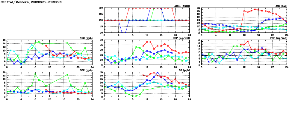 | Air Quality Data Time Series in Central/Western (2018/06/29) | ( Line colors: Day -3 Day -2 Day -1 Current day ) | 2D Map Current AQHI |