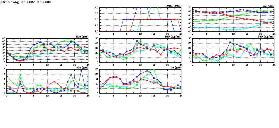 | Air Quality Data Time Series in Kwun Tong (2018/06/30) | ( Line colors: Day -3 Day -2 Day -1 Current day ) | 2D Map Current AQHI |