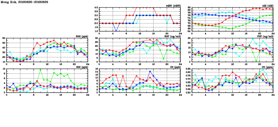 | Air Quality Data Time Series in Mong Kok (2018/06/29) | ( Line colors: Day -3 Day -2 Day -1 Current day ) | 2D Map Current AQHI |