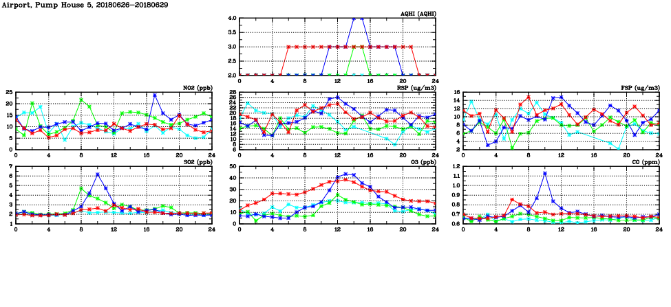 | Air Quality Data Time Series in Airport, Pump House 5 (2018/06/29) | ( Line colors: Day -3 Day -2 Day -1 Current day ) | 2D Map Current AQHI |
