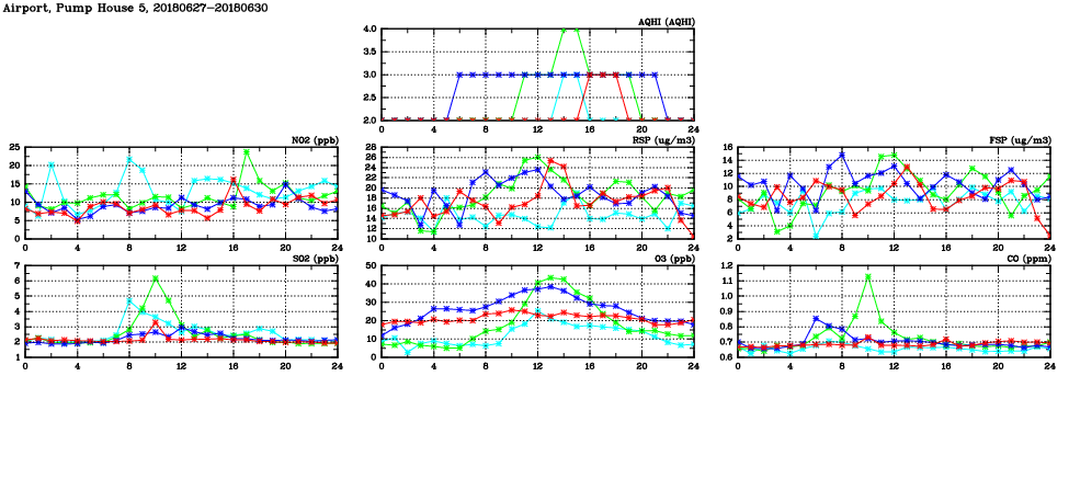 | Air Quality Data Time Series in Airport, Pump House 5 (2018/06/30) | ( Line colors: Day -3 Day -2 Day -1 Current day ) | 2D Map Current AQHI |