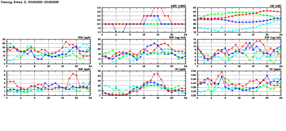 | Air Quality Data Time Series in Tseung Kwan O (2018/06/28) | ( Line colors: Day -3 Day -2 Day -1 Current day ) | 2D Map Current AQHI |