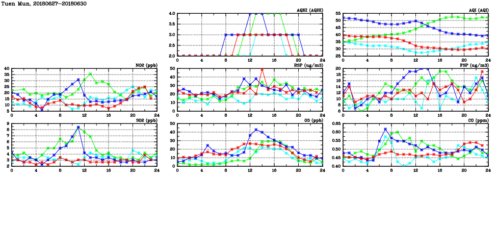 | Air Quality Data Time Series in Tuen Mun (2018/06/30) | ( Line colors: Day -3 Day -2 Day -1 Current day ) | 2D Map Current AQHI |