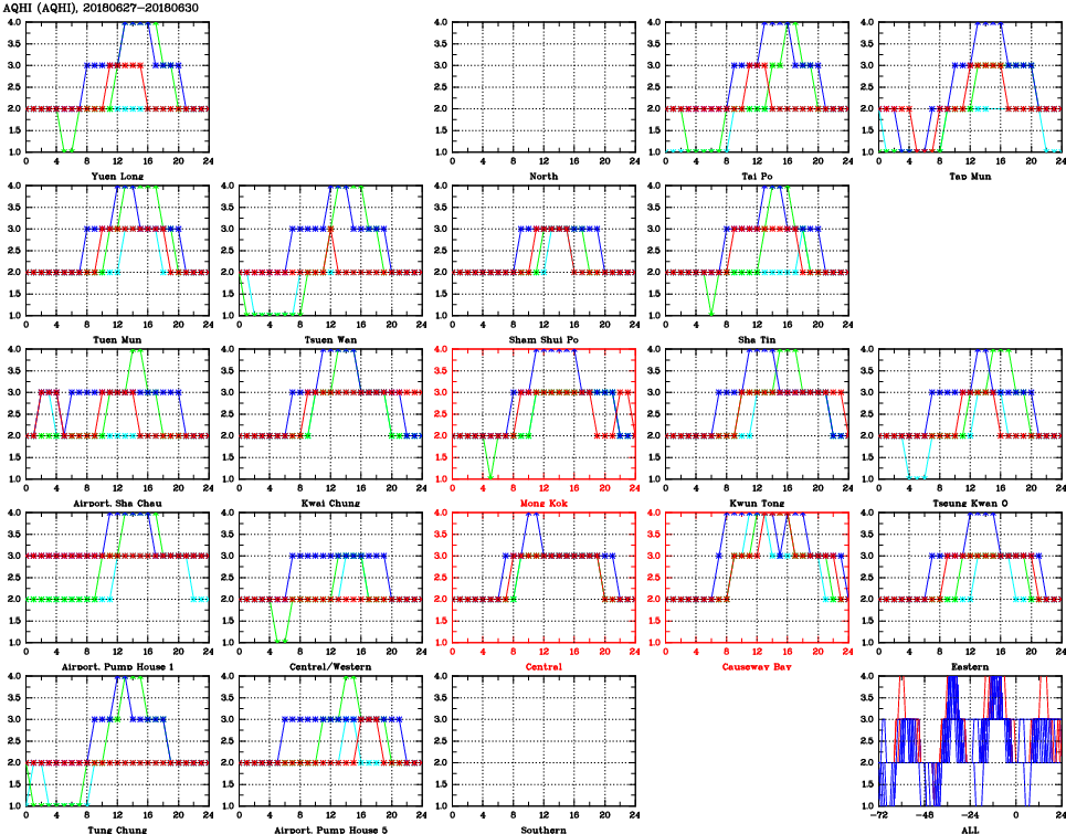 | Air Quality Data Time Series for AQHI (2018/06/30) | ( Line colors: Day -3 Day -2 Day -1 Current day ) | 2D Map Current AQHI |