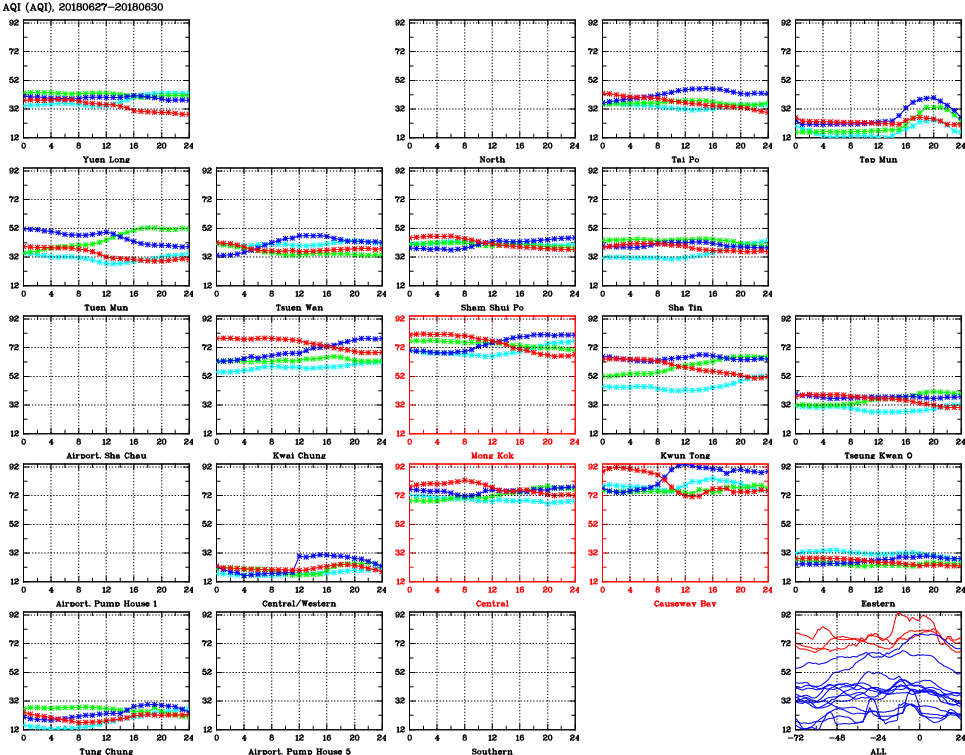 | Air Quality Data Time Series for AQI (2018/06/30) | ( Line colors: Day -3 Day -2 Day -1 Current day ) | 2D Map Current AQHI |