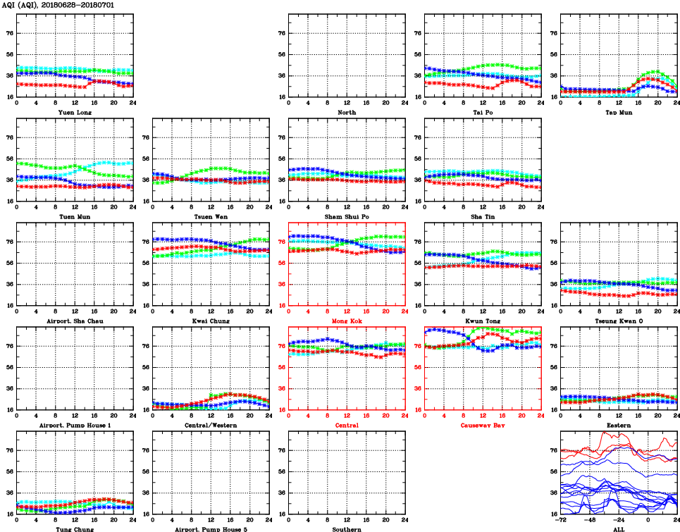 | Air Quality Data Time Series for AQI (2018/07/01) | ( Line colors: Day -3 Day -2 Day -1 Current day ) | 2D Map Current AQHI |