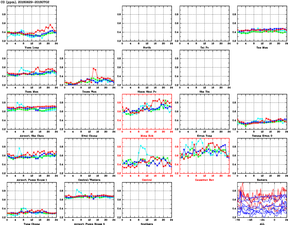| Air Quality Data Time Series for CO (2018/07/02) | ( Line colors: Day -3 Day -2 Day -1 Current day ) | 2D Map Current AQHI |