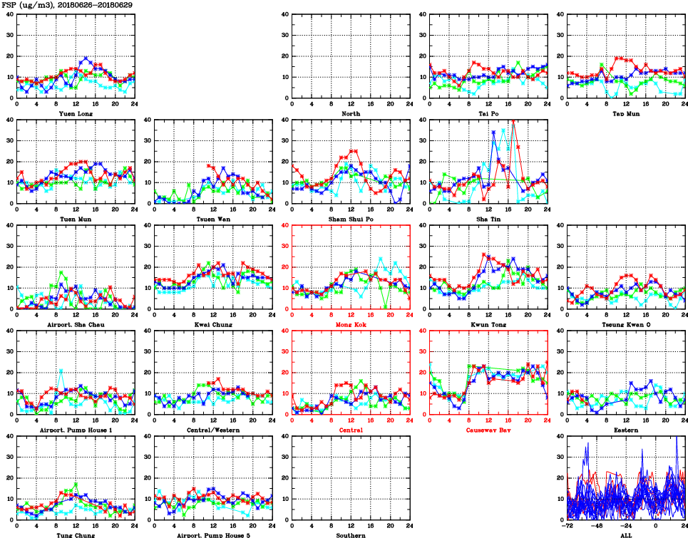 | Air Quality Data Time Series for FSP (2018/06/29) | ( Line colors: Day -3 Day -2 Day -1 Current day ) | 2D Map Current AQHI |