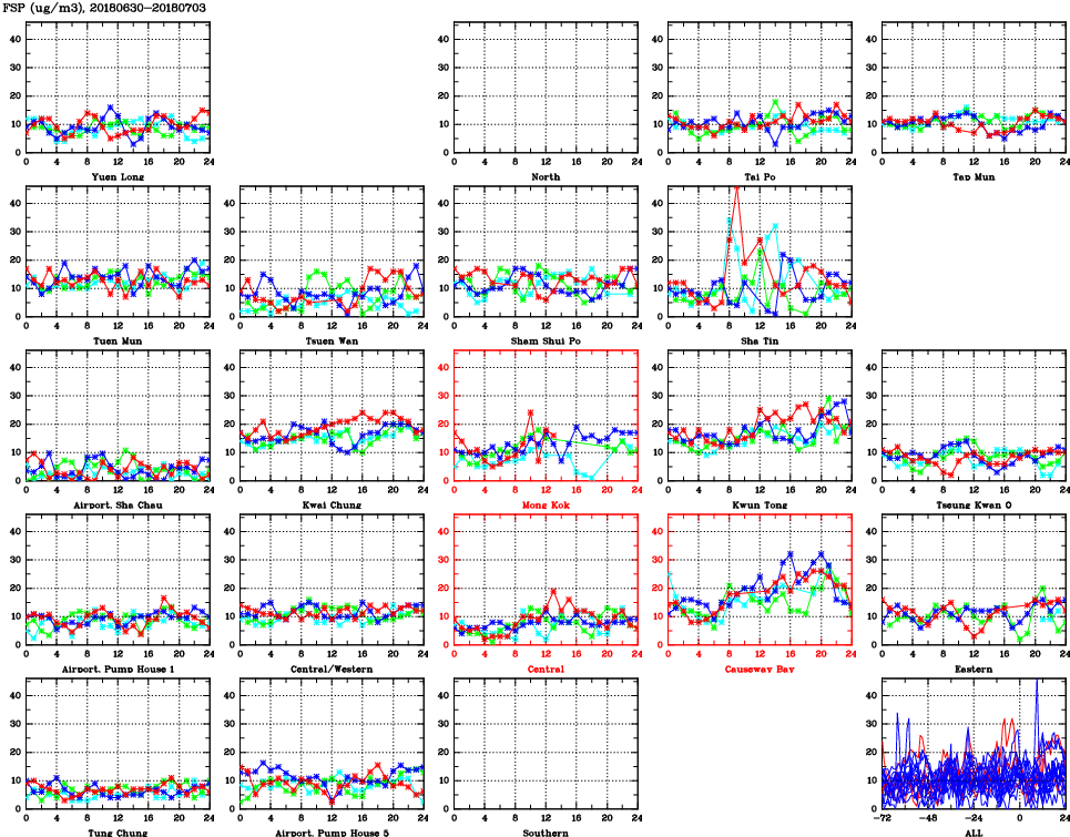 | Air Quality Data Time Series for FSP (2018/07/03) | ( Line colors: Day -3 Day -2 Day -1 Current day ) | 2D Map Current AQHI |