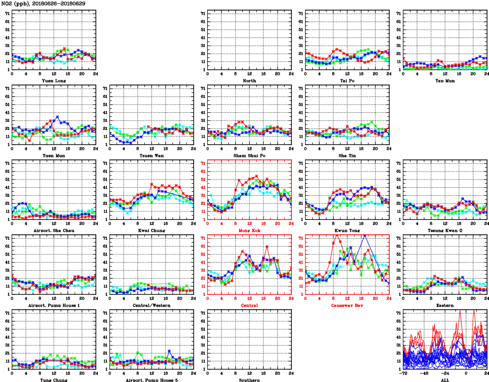 | Air Quality Data Time Series for NO2 (2018/06/29) | ( Line colors: Day -3 Day -2 Day -1 Current day ) | 2D Map Current AQHI |