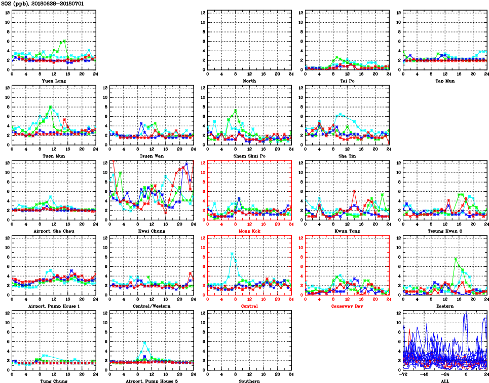 | Air Quality Data Time Series for SO2 (2018/07/01) | ( Line colors: Day -3 Day -2 Day -1 Current day ) | 2D Map Current AQHI |