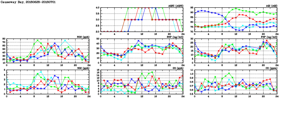 | Air Quality Data Time Series in Causeway Bay (2018/07/01) | ( Line colors: Day -3 Day -2 Day -1 Current day ) | 2D Map Current AQHI |