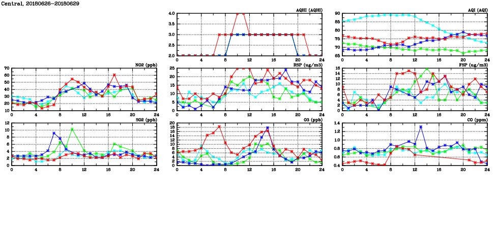| Air Quality Data Time Series in Central (2018/06/29) | ( Line colors: Day -3 Day -2 Day -1 Current day ) | 2D Map Current AQHI |