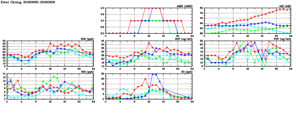 | Air Quality Data Time Series in Kwai Chung (2018/06/29) | ( Line colors: Day -3 Day -2 Day -1 Current day ) | 2D Map Current AQHI |