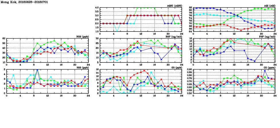 | Air Quality Data Time Series in Mong Kok (2018/07/01) | ( Line colors: Day -3 Day -2 Day -1 Current day ) | 2D Map Current AQHI |