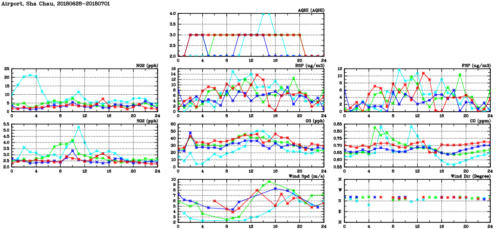 | Air Quality Data Time Series in Airport, Sha Chau (2018/07/01) | ( Line colors: Day -3 Day -2 Day -1 Current day ) | 2D Map Current AQHI |
