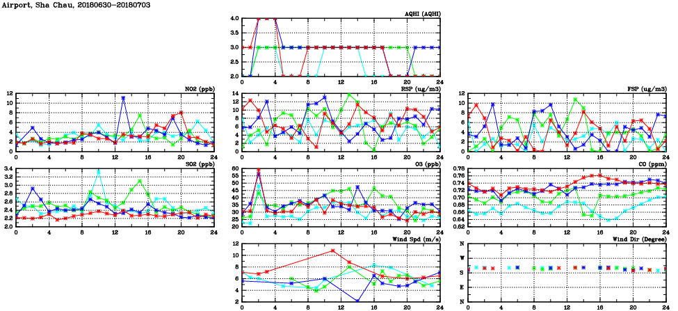 | Air Quality Data Time Series in Airport, Sha Chau (2018/07/03) | ( Line colors: Day -3 Day -2 Day -1 Current day ) | 2D Map Current AQHI |
