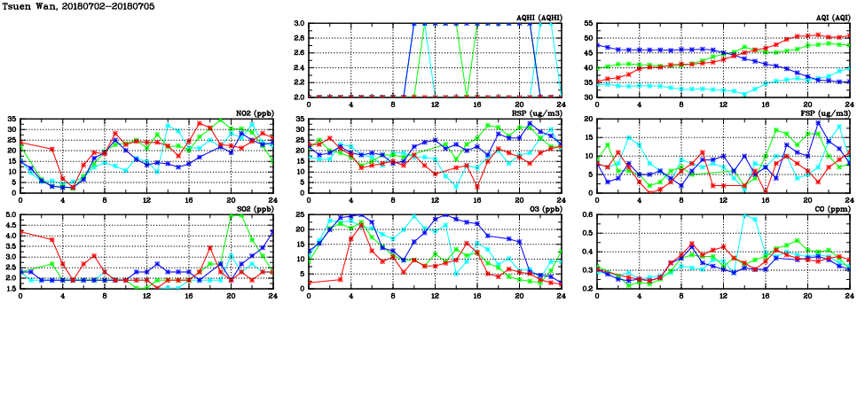 | Air Quality Data Time Series in Tsuen Wan (2018/07/05) | ( Line colors: Day -3 Day -2 Day -1 Current day ) | 2D Map Current AQHI |