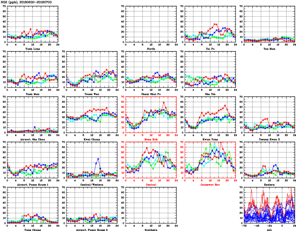 | Air Quality Data Time Series for NO2 (2018/07/03) | ( Line colors: Day -3 Day -2 Day -1 Current day ) | 2D Map Current AQHI |