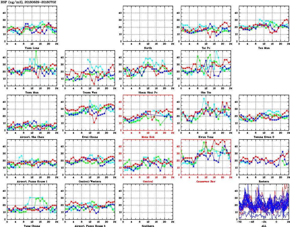| Air Quality Data Time Series for RSP (2018/07/02) | ( Line colors: Day -3 Day -2 Day -1 Current day ) | 2D Map Current AQHI |