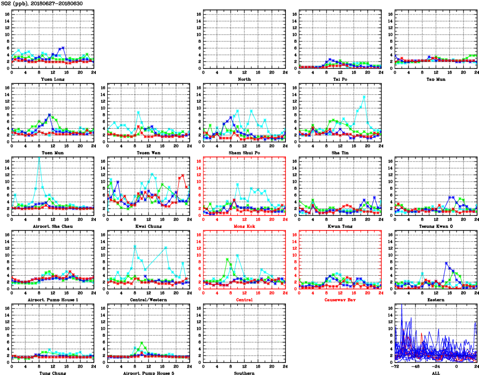 | Air Quality Data Time Series for SO2 (2018/06/30) | ( Line colors: Day -3 Day -2 Day -1 Current day ) | 2D Map Current AQHI |