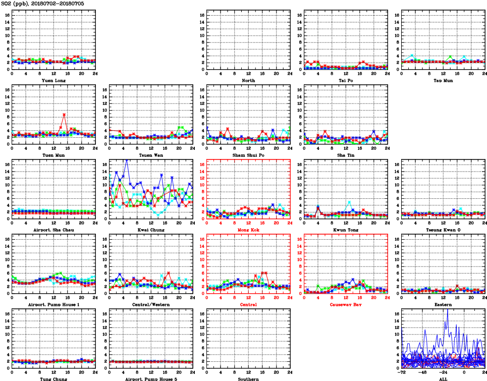 | Air Quality Data Time Series for SO2 (2018/07/05) | ( Line colors: Day -3 Day -2 Day -1 Current day ) | 2D Map Current AQHI |