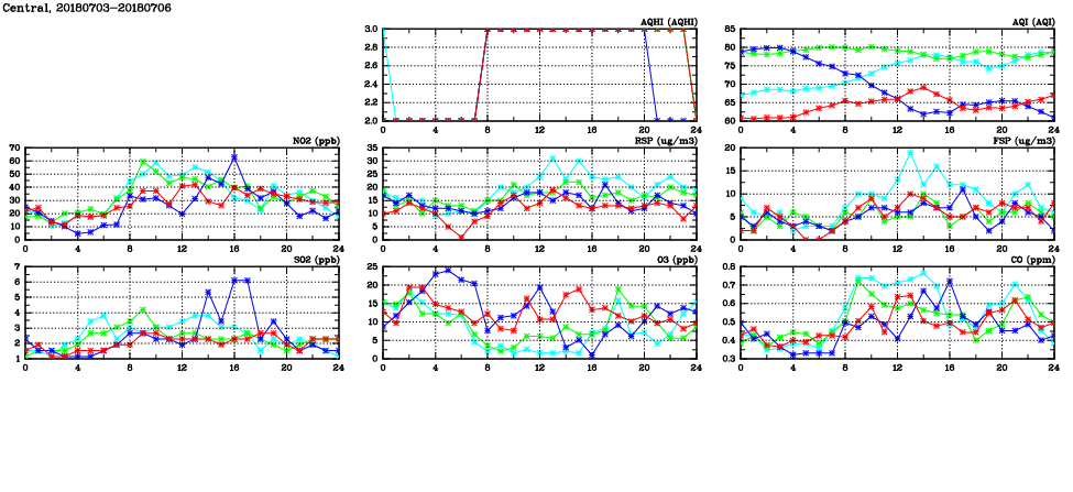 | Air Quality Data Time Series in Central (2018/07/06) | ( Line colors: Day -3 Day -2 Day -1 Current day ) | 2D Map Current AQHI |