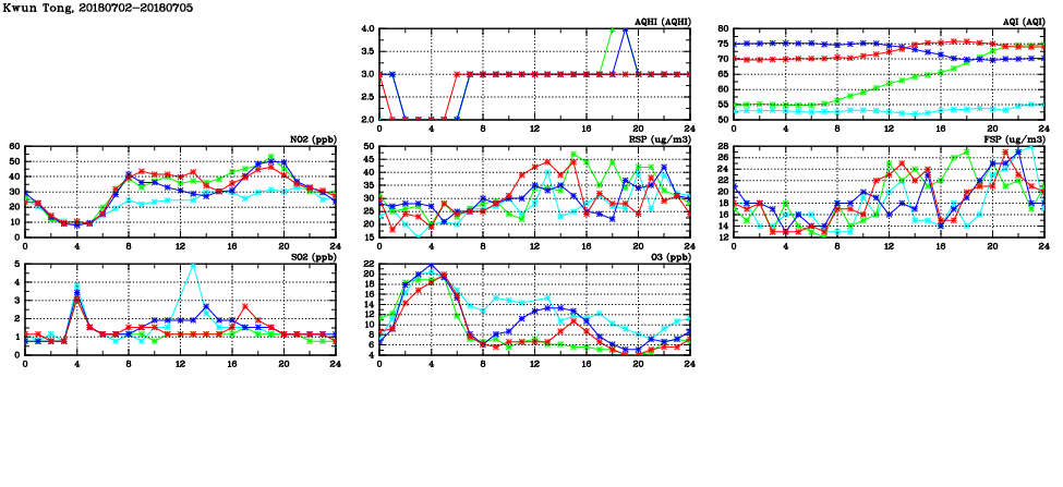 | Air Quality Data Time Series in Kwun Tong (2018/07/05) | ( Line colors: Day -3 Day -2 Day -1 Current day ) | 2D Map Current AQHI |
